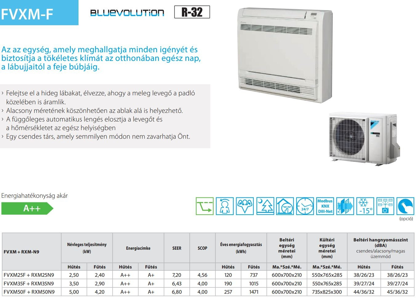 A Daikin FVXM50F / RXM50R Parapet Inverteres Split klíma fontos tulajdonságai: