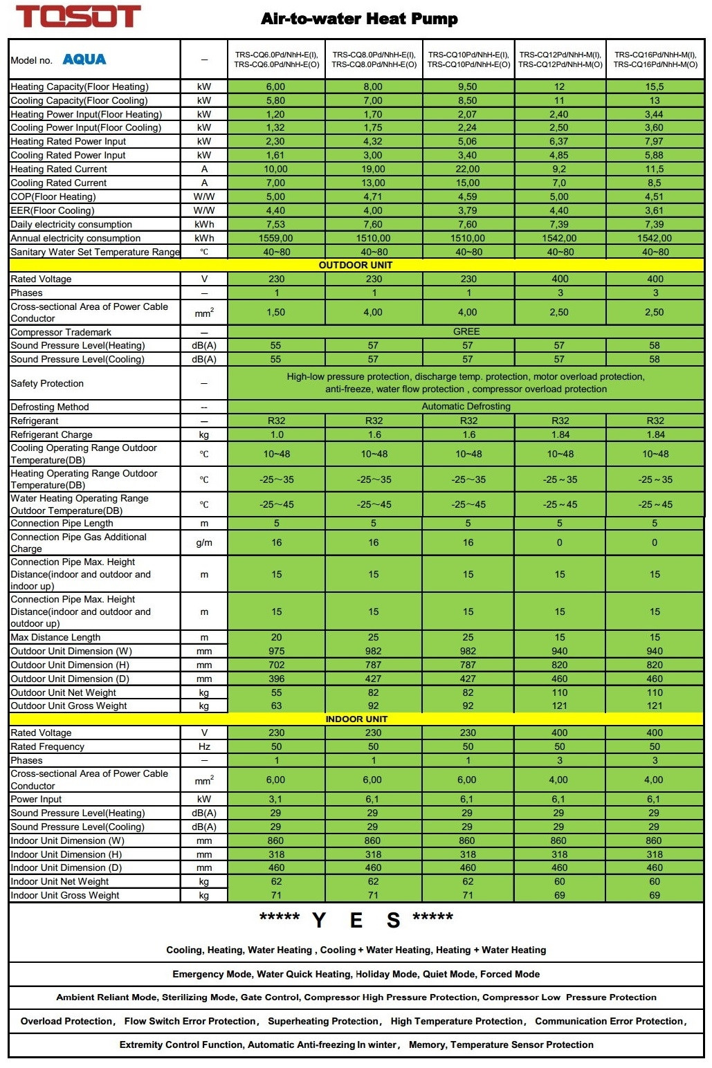 A Tosot AQUA TRS-CQ10Pd/NhH-E osztott hőszivattyú (R32, 9,5 kW, 1 fázis) fontos tulajdonságai: